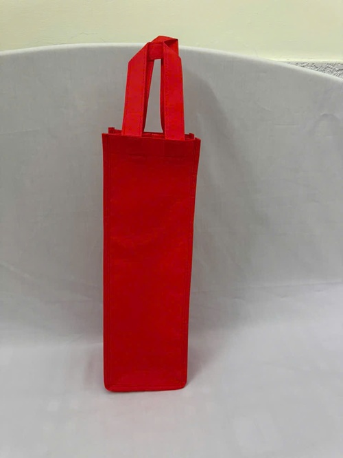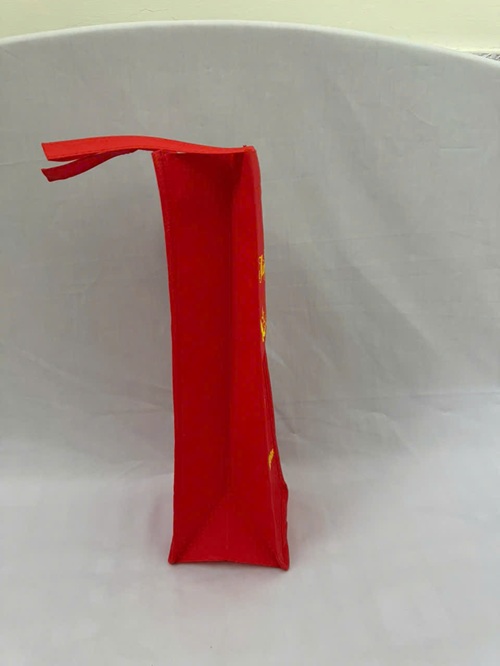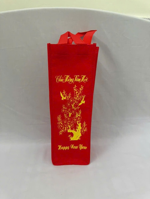 Túi vải màu đỏ với chữ chúc mừng năm mới để 1 chai rươu, chai mật ong, nước trái cây, nước mắm hoặc các sản phẩm dạng chai đứng